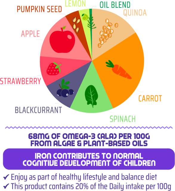 Contains nearly 64% vegetables, plus seeds providing an excellent source of fibre for healthy tummies, high protein for muscle growth and more nutrients. With high quinoa content, essential oils and minerals including Algae oil to provide Omega 3 for brain support and development.